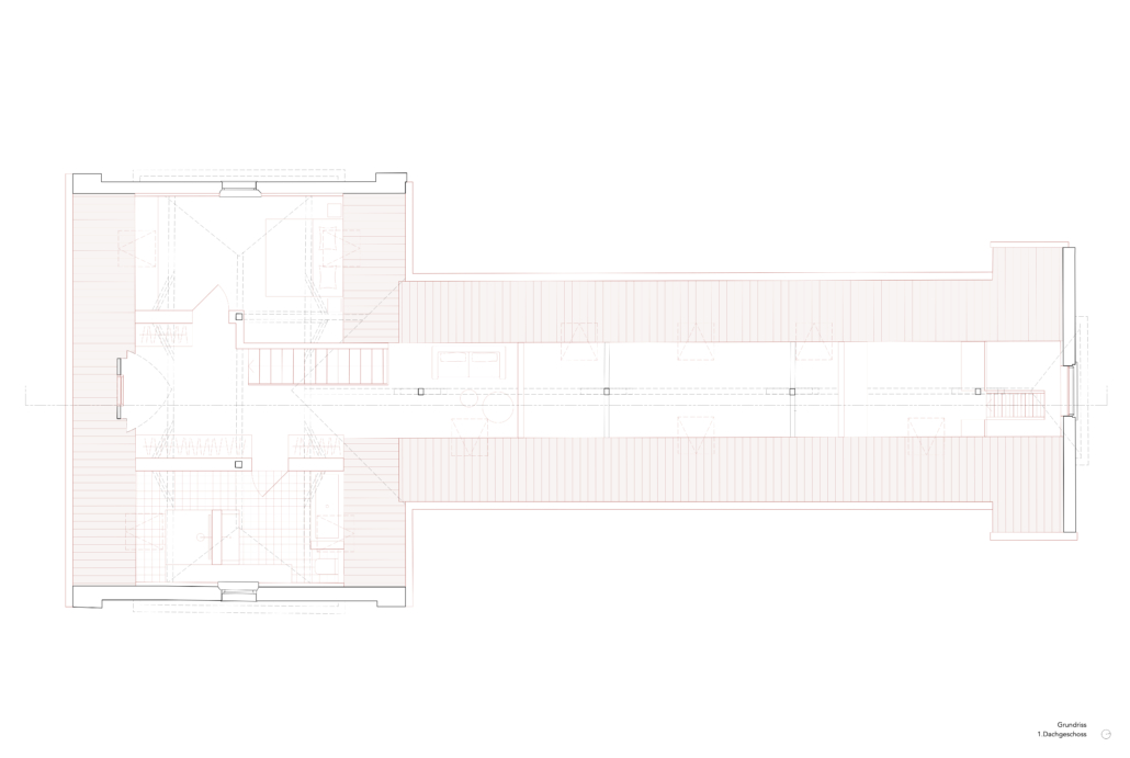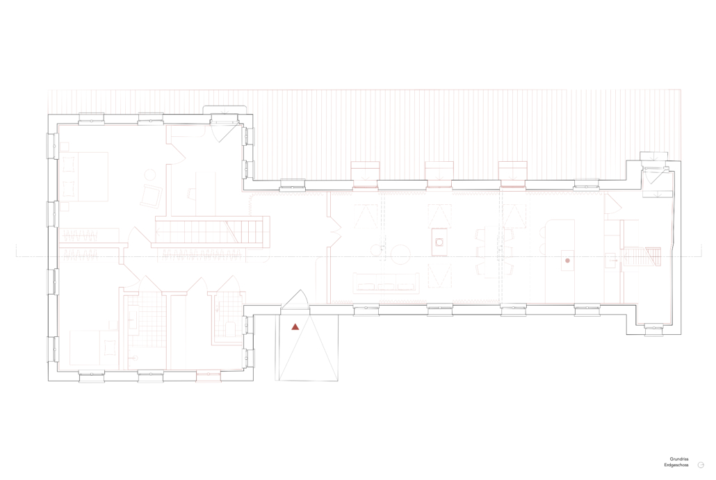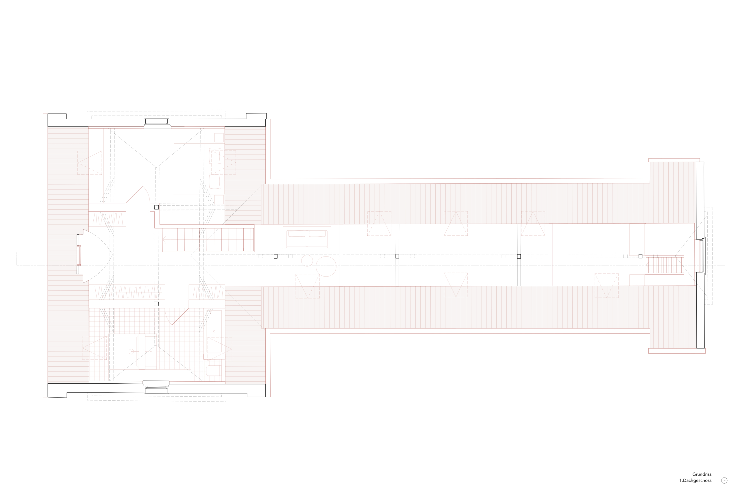 Zentrum des Grundrisskonzepts ist der Wohn- und Esszimmer. Die teilweise Rückbau der Bestandsbalkendecke schafft einen zweigeschossigen Raum, der dem Haus seine neue räumliche Mitte verleiht. Hochwertige Materialien und ein sorgfältig entwickeltes Innenraumkonzept verleihen dem Bestand eine klare, zeitlose Wohnqualität. Durch den Erhalt und die Weiterentwicklung der bestehenden Struktur wird zudem ein wesentlicher Beitrag zu einer nachhaltigen Ressourcennutzung geleistet.
