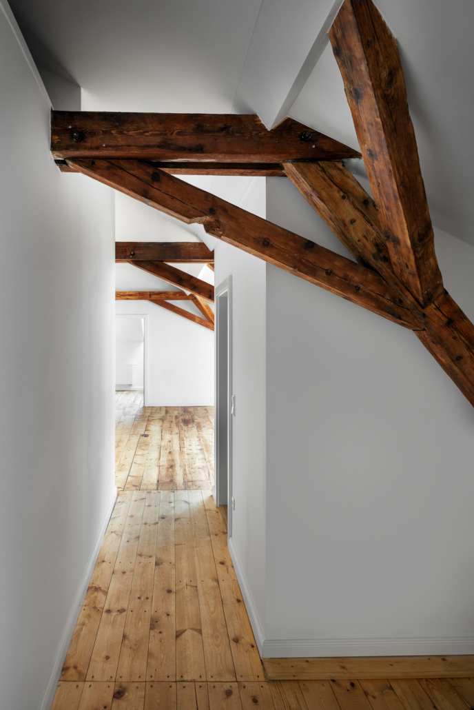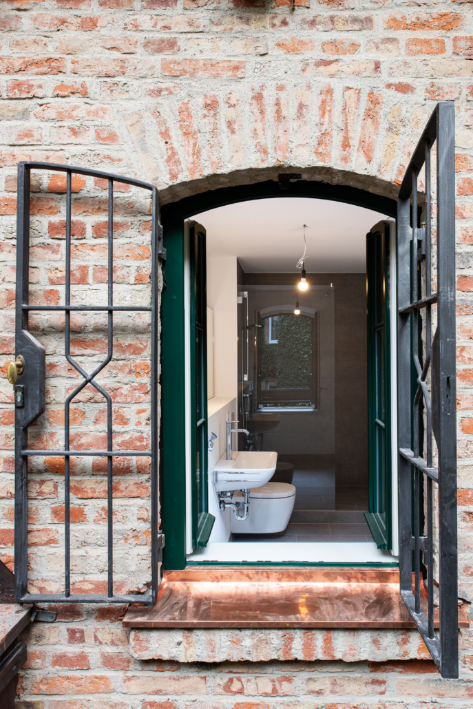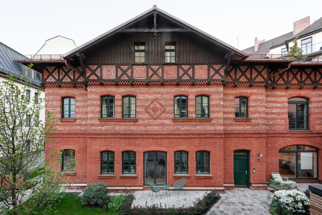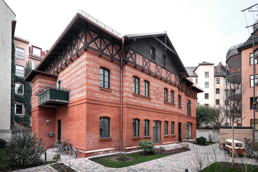 Versteckt in einem Hinterhof im Dreimühlenviertel befindet sich ein ehemaliger Pferdestall. Insbesondere die Fassade, eine zweifarbige Ziegelbauweise mit Holzfachwerk ist in München einmalig. Im Zuge der Kernsanierung wurde der denkmalgeschützte Dachstuhl ausgebaut, ein Townhouse mit Garten konzipiert und der Innenhof entsiegelt und begrünt. So findet eine durchmischte Bewohnerschaft ihr Zuhause in den unterschiedlichen Wohnungsgrößen von der 2- Zimmer Wohnung bis zum Townhouse. Zwei neue Terrassen gehen ebenerdig in den Innenhof und bieten somit auch kleineren Wohnungen einen privaten Außenraum im Einzeldenkmal.
